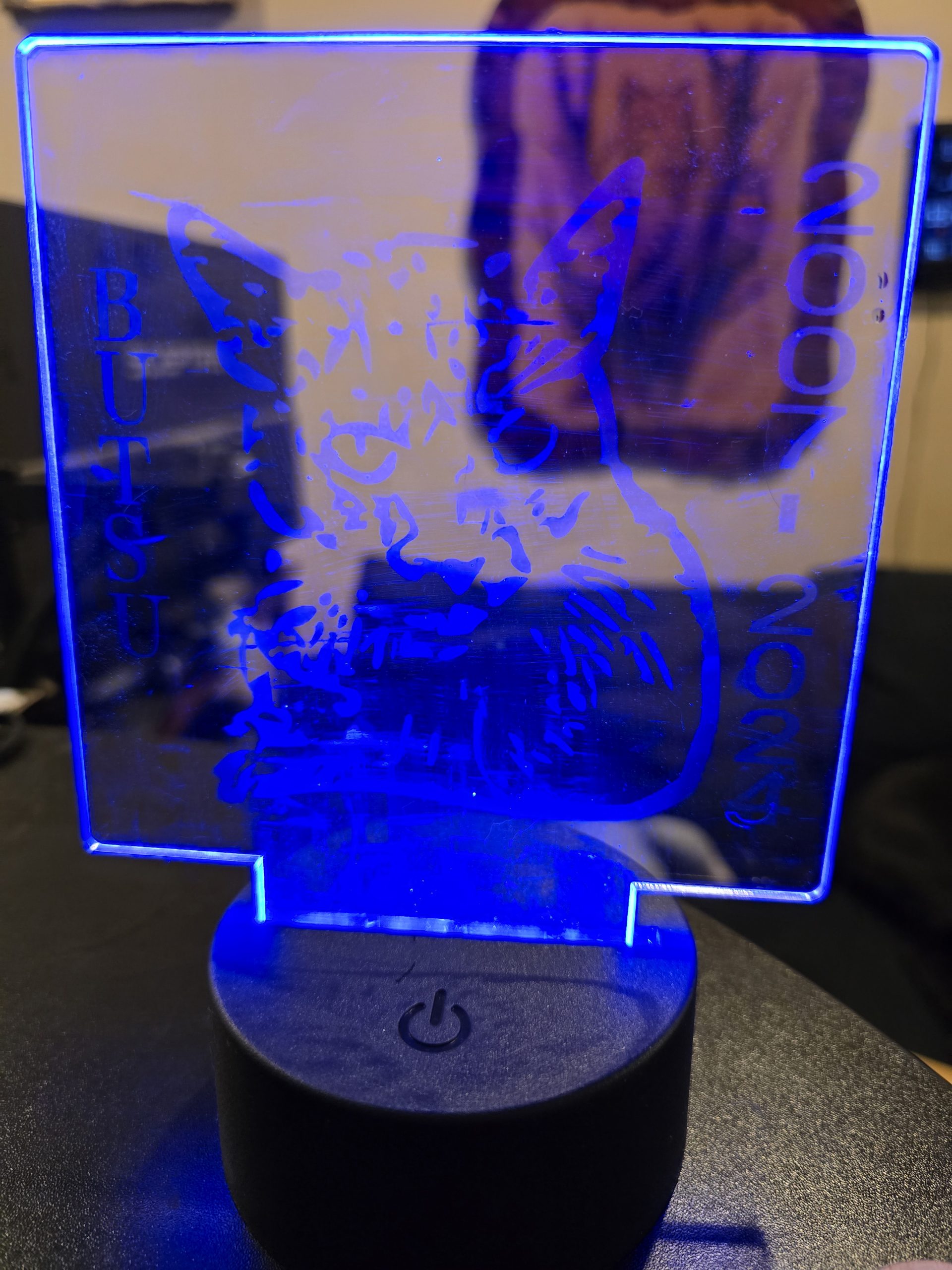 Engraved acrylic sign with hockey puck light that changes colors. Runs on batteries or with included USB cord.